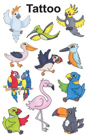 Kedves kis madár és papagáj formájú tetoválások gyerekeknek. Lepje meg gyermekeit fantasztikus tetoválásokkal, amelyek tökéletesek ajándékként, jutalomként, születésnapi partikhoz vagy egyszerűen csak játékként.