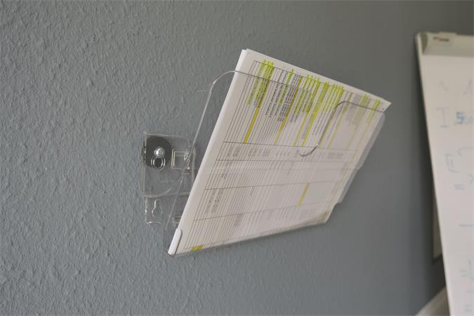 Prospektustartó mágneses rögzítéssel A4-es méretű, fekvő formátumú információs anyagok számára.
